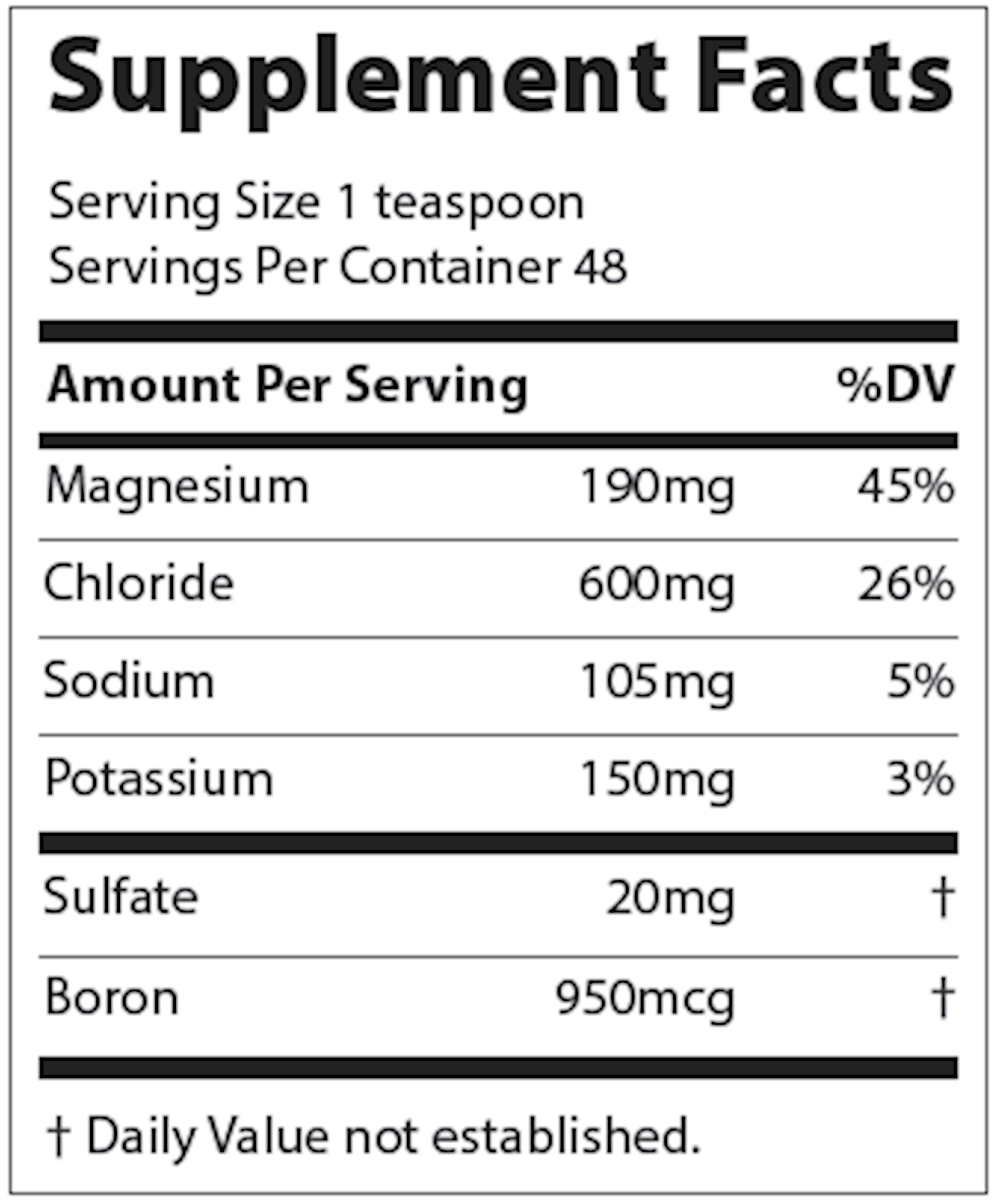 Serving Size: 1 Teaspoon Servings Per Container: 48 Disclaimer Amount Per Serving Magnesium (from ConcenTrace) 200 mg Chloride (from ConcenTrace) 500 mg Sodium (from Utah Sea Minerals) 120 mg Potassium (as Potassium Chloride) 150 mg Sulfate (from ConcenTrace) 50 mg Boron (from ConcenTrace) 950 mcg Other ingredients: ConcenTrace, purified water, Utah Sea Minerals, citric acid