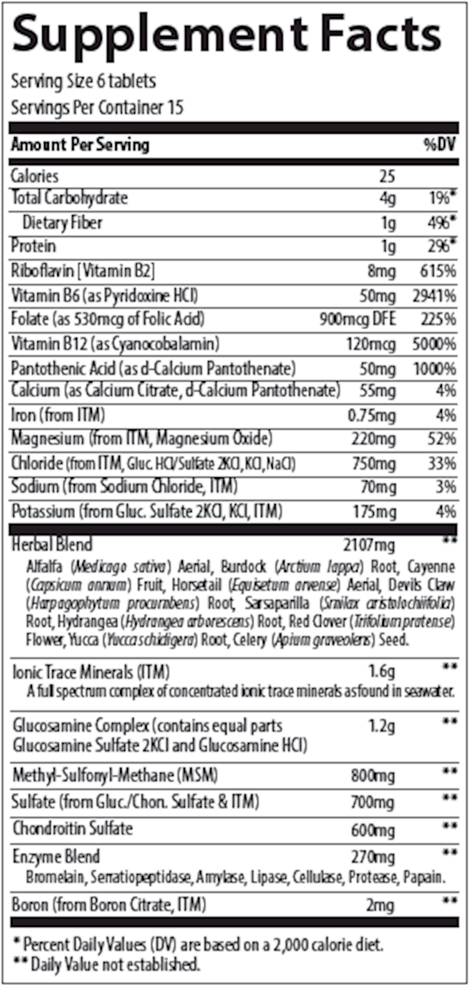 Serving Size: 6 Tablet Servings Per Container: 15 Disclaimer Amount Per Serving Calories 25 Total Carbohydrate 4 g Dietary Fiber 1 g Protein 1 g Riboflavin [Vitamin B2] 8 mg Vitamin B6 (as Pyridoxine HCl) 50 mg Folic Acid 530 mcg Vitamin B12 (as Cyanocobalamin) 160 mcg Pantothenic Acid (as d-Calcium Pantothenate) 52 mg Calcium (as Citrate, d-Calcium Pantothenate) 55 mg Iron 0.9 mg Magnesium (from ConcenTrace, Magnesium Oxide) 220 mg Chloride (from ConcenTrace, Gluc. HCl/Sulfate 2KCl, KCl, NaCl) 925 mg Sodium (from Sodium Chloride, ConcenTrace) 90 mg Potassium (from Gluc. Sulfate 2KCl, KCl, ConcenTrace) 175 mg Herbal Blend 2 g Alfalfa leaf Burdock Root Capsicum Fruit Horsetail Herb Devils Claw Tuber Sarsaparilla Root Turmeric Root Red Clover Herb Yucca Root Celery Seed Low-Sodium ConcenTrace: A complex of over 72 ionic trace minerals from Utahs inland sea, tthe Great Salt Lake 1.6 g Glucosamine Complex (contains equal parts Glucosamine Sulfate 2KCl and Glucosamine HCl) 1.2 g Methyl-Sulfonyl-Methane (MSM) 800 mg Sulfate (from Gluc./Chon. Sulfate & ConcenTrace) 800 mg Chondroitin Sulfate 600 mg Enzyme Complex 320 GDU Units Bromelain 10,000 Serrapeptase Units Peptizyme SP EN 6 MCU Units Papain Plus the following natural source enzymes: Amylase, Protease, Lipase, Cellulase 300 mg Boron (as Boron Citrate) 2 mg Other ingredients: Stearic acid, microcrystalline cellulose, calcium stearate, croscarmellose sodium, silicon dioxide