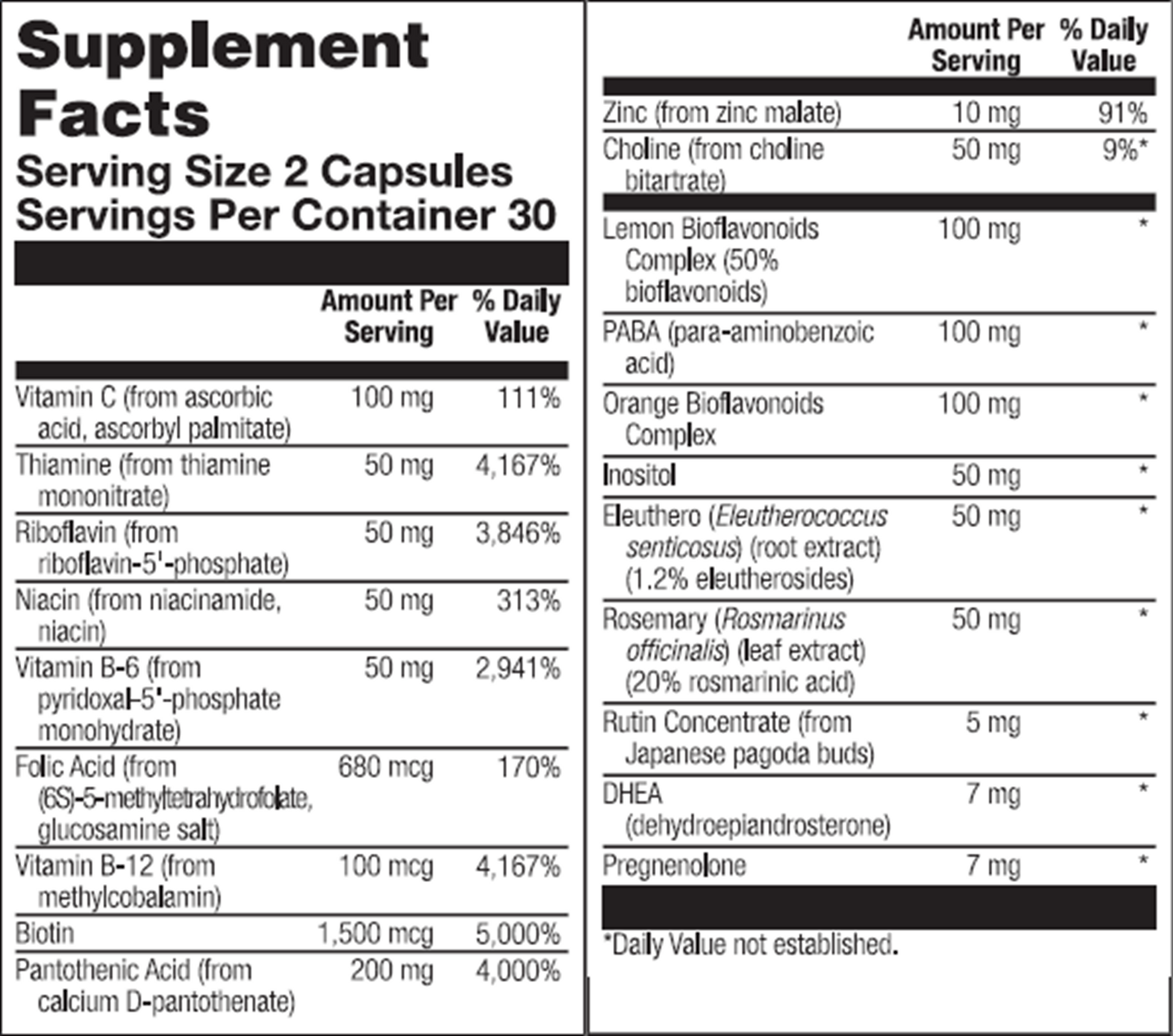Serving Size: 2 Vegetable Capsule Servings Per Container: 30 Disclaimer Amount Per Serving Vitamin C (as ascorbic acid, ascorbyl palmitate) 100 mg 111% Thiamin (as thiamin mononitrate) 50 mg 4167% Riboflavin (as riboflavin 5'-phosphate) 50 mg 3846% Niacin (as niacinamide, niacin) 50 mg 313% Vitamin B6 (as pyridoxal 5-phosphate, pyridoxine) 50 mg 2941% Folic Acid (from (6S)-5-methyltetrahydrofolate, glucosamine salt) 680 mcg 170% Vitamin B12 (from methylcobalamin) 100 mcg 4167% Biotin 1500 mcg 5000% Pantothenic acid (as calcium D-pantothenate) 200 mg 4000% Zinc (as zinc malate) 10 mg 91% Choline (from choline bitartrate) 50 mg 9% Lemon Bioflavonoids Complex (50% bioflavonoids) 100 mg PABA (para amino benzoic acid) 100 mg Orange Bioflavonoids Complex 100 mg Inositol 50 mg Eleuthero (Eleutherococcus senticosus) (root extract) (1.2% eleutherosides) 50 mg Rosemary (Rosmarinus officinalis) (leaf extract) (20% rosmarinic acid) 50 mg Rutin concetrate (from japanese pagoda buds) 5 mg DHEA (dehydroepiandrosterone) 7 mg Pregnenolone 7 mg Other ingredients: cellulose, vegetable cellulose capsule, silica, rice bran extract