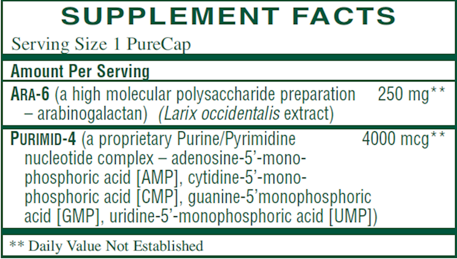 Serving Size: 1 Capsule Servings Per Container: 60 Disclaimer Amount Per Serving ARA-6 (a high molecular polysaccharide preparation arabinogalactan) (Larix occidentalis extract) 250 mg PURIMID-4 a proprietary Purine/Pyrimidine nucleotide complex 4000 mcg adenosine-5-monophosphoric acid [AMP] cytidine-5-monophosphoric acid [CMP] guanine-5monophosphoric acid [GMP] uridine-5-monophosphoric acid [UMP] Other ingredients: Gelatin, glycerin, silica, water