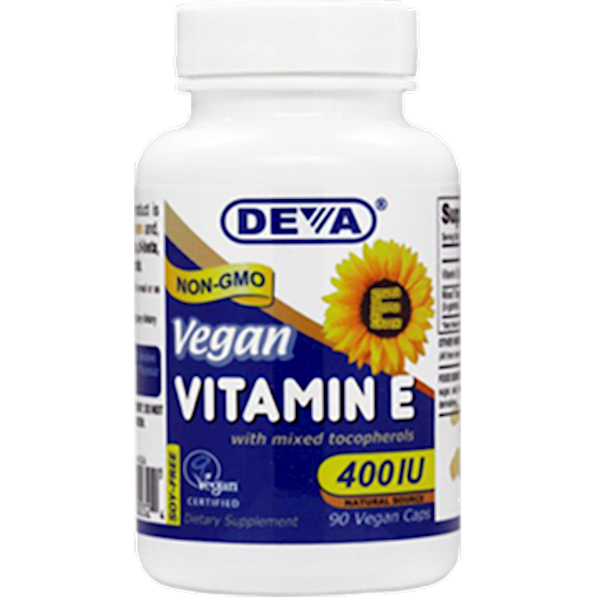 Vegan Vitamin E with mixed tocopherols - Plant Sourced d-alpha. Soy-free, non-GMO Vitamin E, made from sunflowers. Vitamin E is a very important part of our daily diet. A naturally occuring antioxidant, this vitamin can be a helpful tool against oxidation.* If you are not getting enough of this vitamin in your food, a supplement can be an excellent choice. Deva's supplement offers 400IU of Vitamin E with mixed tocopherols derived from a plant source (i.e., non-gmo sunflowers). There are a total of four different tocopherols that are present in our product: D-alpha, D-beta, D-gamma and D-delta, as opposed to the commonly found single d-alpha supplements on the market. If you are not getting enough Vitamin E in your diet, or if you feel that an additional supplement could help, taking a vegan 400IU plant source Vitamin E with mixed tocopherols can be an excellent idea. Deva Vitamin E with mixed tocopherols is 100% vegan, vegetarian. Deva products have been registered by the non-profit Vegan Society. This non-profit organization, which first coined the phrase vegan, has a strict and detailed registration process for vegan products.