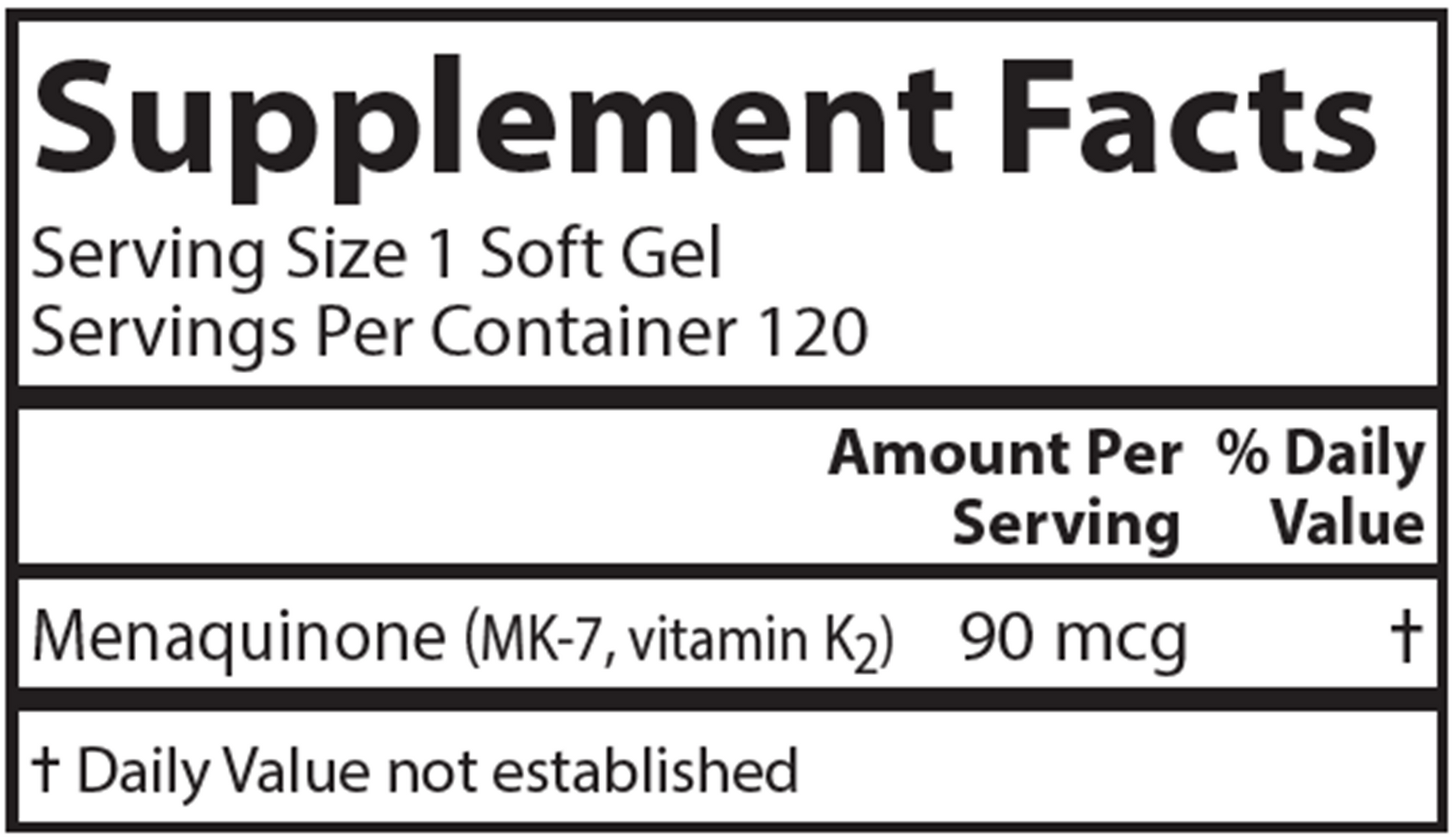 Serving Size: 1 SoftGel Servings Per Container: 120 Disclaimer Amount Per Serving Menaquinone (MK-7, vitamin K2) 90 mcg Other ingredients: Softgel shell (beef gelatin, glycerin, water, carob), safflower oil, sunflower oil