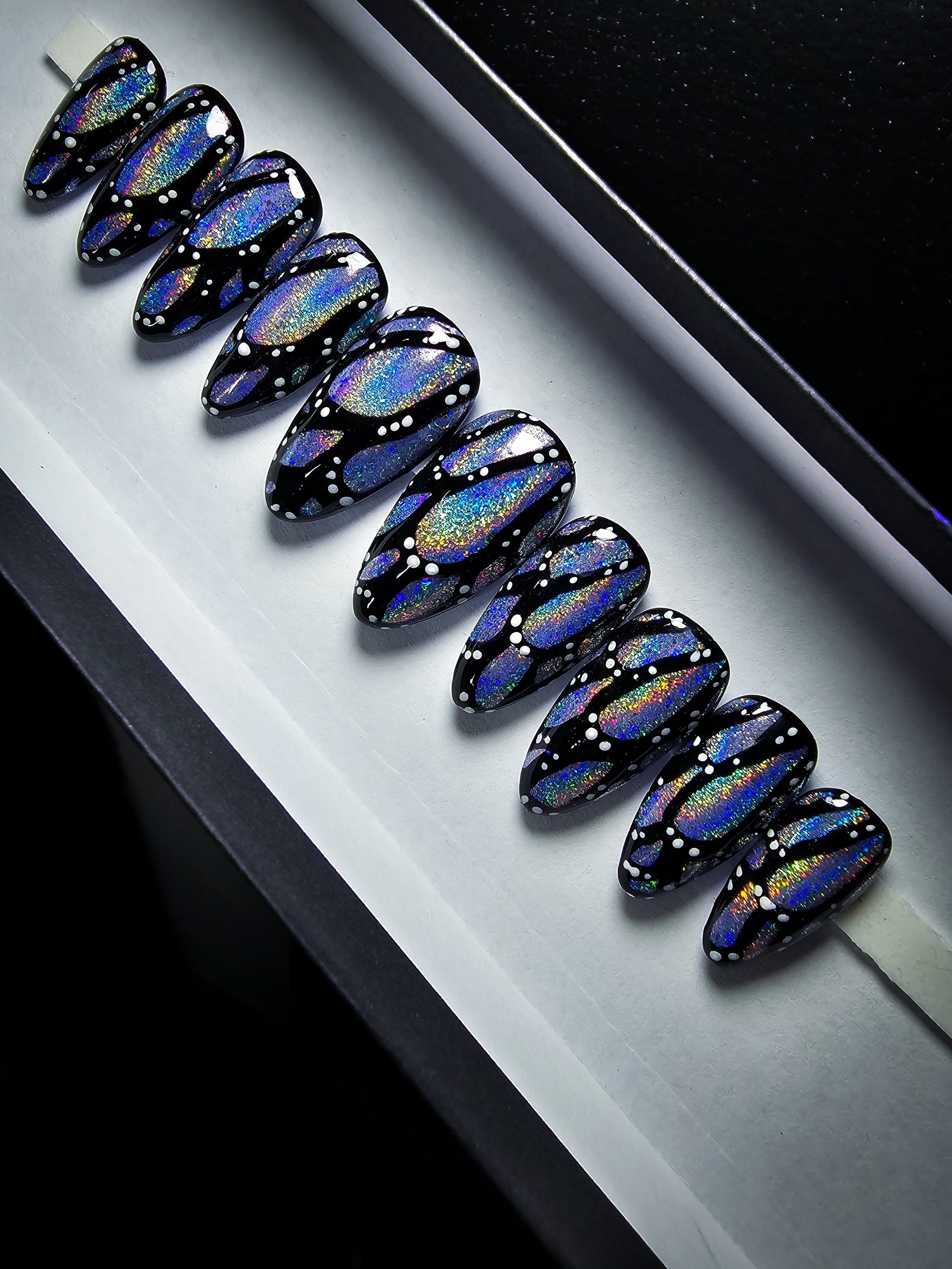 ✨Transform your nails into a work of art with our Vivid Beauty Press on Nail Set. The pale cool toned purple base perfectly complements the hand-painted holographic butterfly wing design on all 10 nails, giving you a stunning and unique look that will surely turn heads. 💅
