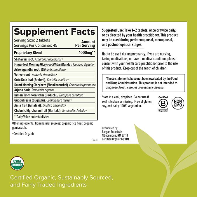 Serving Size: 1 Tablet Servings Per Container: 90 Disclaimer Amount Per Serving Proprietary Blend: 500 mg Shatavari root Asparagus racemosus+ Finger-leaf Morning Glory root (Vidari Kanda) Ipomoea digitata+ Ashwagandha root Withania somnifera+ Vetiver root Vetiveria zizanoides+ Gotu Kola leaf (Brahmi) Centella asiatica+ Dwarf Morning Glory herb (Shankhapushpi) Evolvulus alsinoides+ Arjuna bark Terminalia arjuna+ Indian Tinospora stem (Guduchi) Tinospora cordifolia+ Guggul resin (Guggulu) Commiphora mukul+ Amla fruit (Amalaki) Emblica officinalis+ Chebulic Myrobalan fruit (Haritaki) erminalia chebula+ Other ingredients: Other ingredients, from natural sources:, organic rice flour, organic gum acacia, Free of gluten, soy and dairy