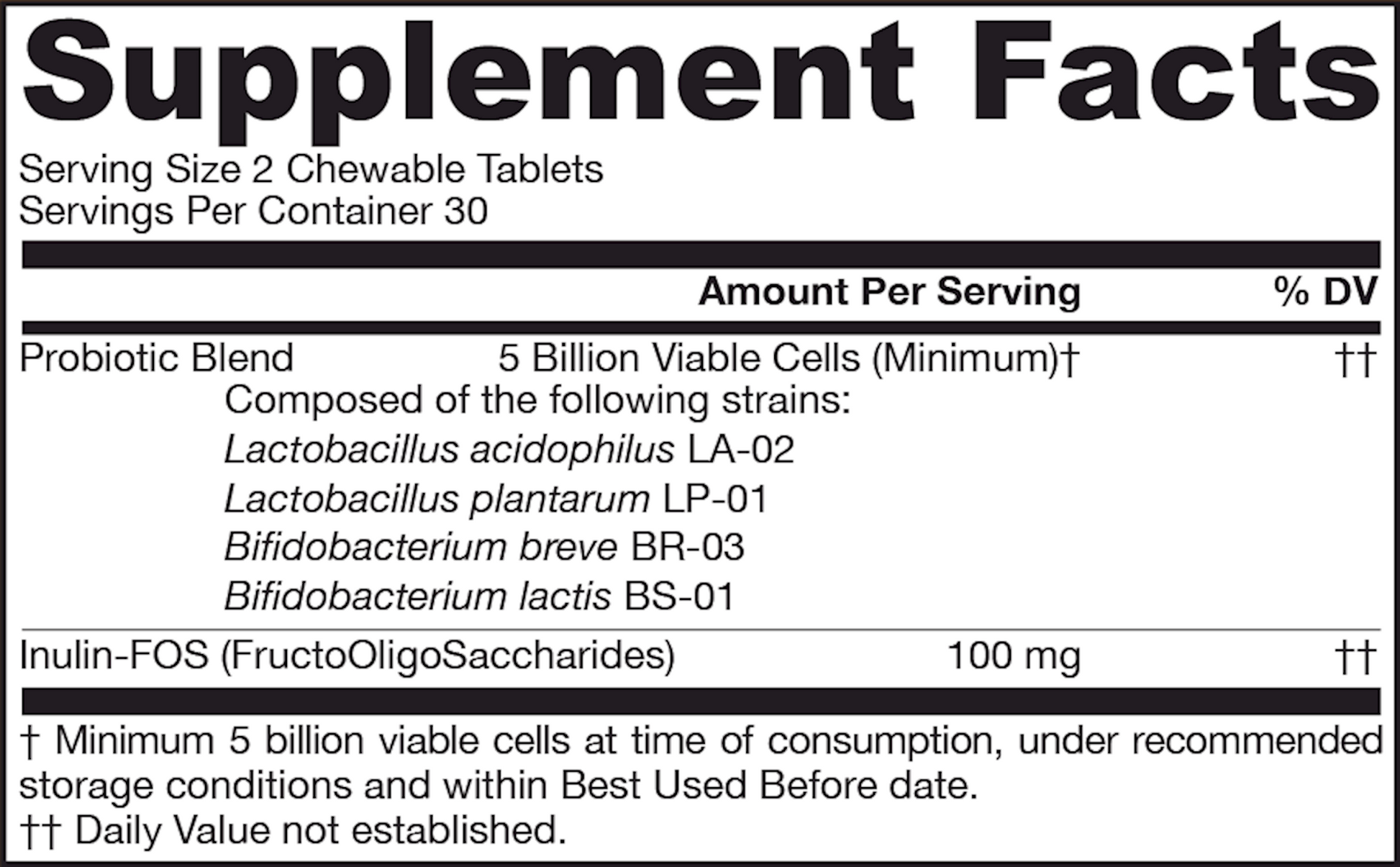 Serving Size: 2 Tablet Servings Per Container: 30 Disclaimer Amount Per Serving Probiotic Blend 5 Billion Viable Cells Composed of the following strains: Lactobacillus acidophilus LA-02 Lactobacillus plantarum LP-01 Bifidobacterium breve BR-03 Inulin-FOS (FructoOligoSaccharides) 100 mg Other ingredients: Xylitol, cellulose, glycerin fatty acid esters (vegetable source), natural chocolate flavor, stearic acid (vegetable source), magnesium stearate (vegetable source), organic cocoa powder, silicon dioxide, MogroPure (Lo Han fruit extract, Momordica grosvenorii)